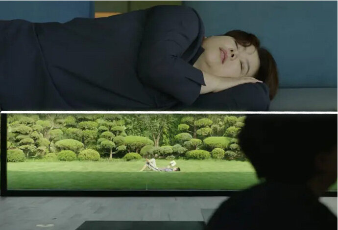 1. Ketika sang asisten rumah tangga membangunkan ibu pemilik rumah di taman, terlihat sebuah garis jendela. Garis ini adalah batas antara si miskin dan si kaya.