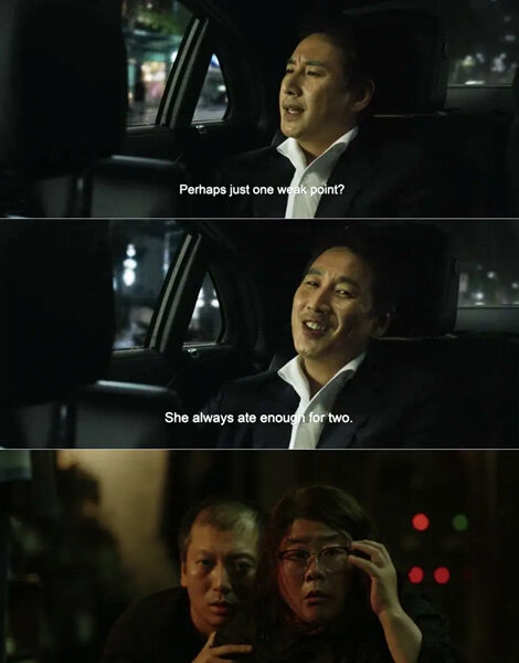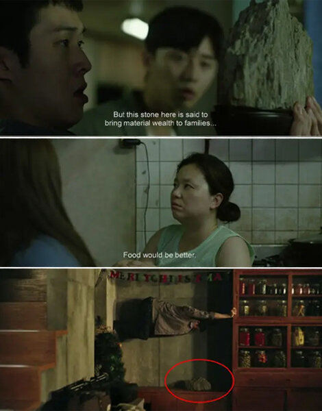 15. Ibu Kim bercanda Min (Seo-joon Park) lebih baik membawa makanan daripada batu. Di akhir film Ki-jung tak sempat memberi makanan untuk Geun-se, malah Ki-woo yang bawa batu ke basemen dan menyebabkan kekacauan dan pembunuhan.