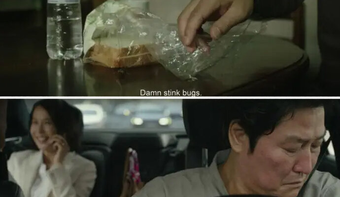 14. Di awal film Bapak Kim memukul serangga berbau busuk dari rotinya. Di akhir film, dialah si serangga berbau busuk di mata keluarga Park.