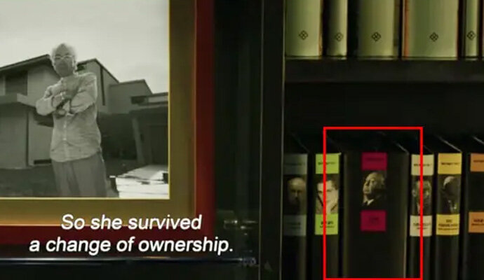 2. Joon-ho Bong tak segan menunjukkan inspirasinya untuk cerita misteri film ini. Buku bergambar Alfred Hitchcock dapat terlihat dalam rak buku koleksi sang pemilik rumah, si Tuan Park.